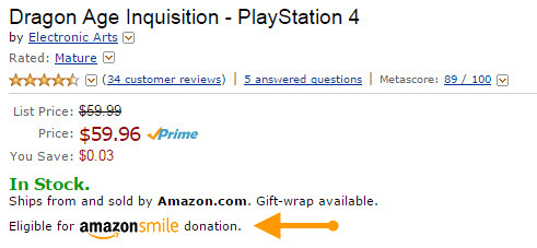 We rely heavily on Amazon for many things because it’s usually cheap, shipping is free (with a Prime membership), and they deliver to your door so we don’t have to spend time, energy and hassle going to the store. We buy things like pet food, cat litter, household cleaning products, toiletries, paper products and plastic bags, some bulk food, and often clothes and games through Amazon and all of it is eligible for donation through Smile. If a product is eligible, you will see an indicator in the product description on Amazon’s Smile website like the one marked with the arrow in the picture above.