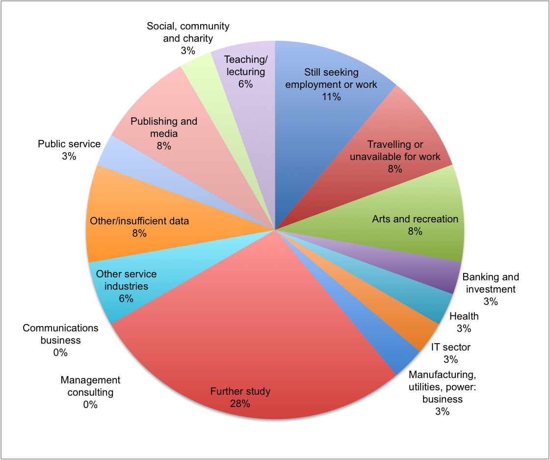 Suppose you wanted to create an infographic that showed the occupations of people with a particular college degree. One simple and clear way to do this is with a pie chart like the one to the right which shows the occupations of people who received a degree in philosophy from Cambridge University. This is an example of a one-to-many mapping where one factor (a philosophy degree) is mapped or linked to many possible other factors (the occupations). Pie charts are especially good at depicting one-to-many mappings.