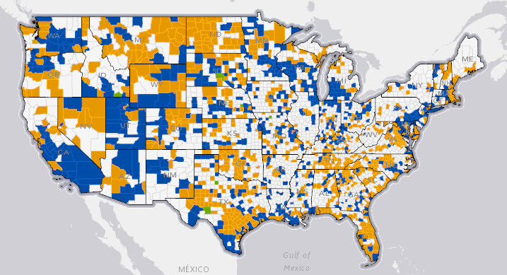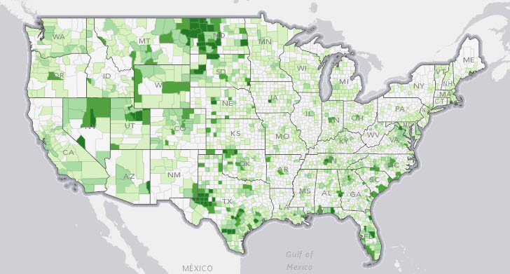 The US Census Bureau has built an interactive map that can answer these questions for every county in the US for the year 2012. The map is composed of two layers that are separated by a slider. The map can be zoomed with the mousewheel and moved by dragging while holding down the left mouse button.