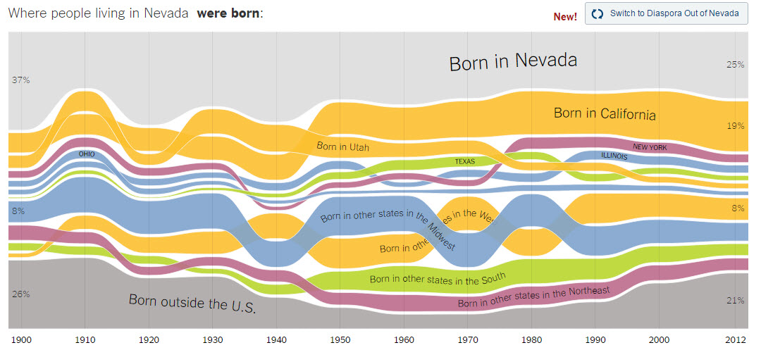 Here’s another example. Which state had the lowest proportion of residents who were born in the state in 2012? Florida, which is widely seen as a destination for retirees from the Northeast and Midwest, is up there with only 36% of the 2012 population born in the state. The clear winner, however, is Nevada with only 25% of the state’s resident’s born in Nevada. The native-born Nevadans are swamped by residents who were either born in California or outside the US. Together these two groups made up 40% of the population of Nevada in 2012.