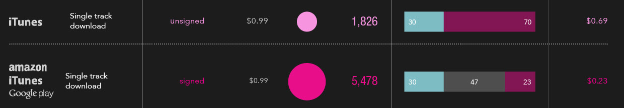 From the infographic it’s easy to see that independent creators take in a larger percentage of the revenue from both streaming and digital sales than musicians who have signed with a label. For example, the sale of a $0.99 single from iTunes pays $0.69 to independent creators and $0.23 to musicians signed with a label. Independent creators also have an advantage when a track is streamed rather than purchased. The magnitude of the advantage differs with different streaming services. For example, signed musicians have to stream 2.45 times as many tracks as independents in order to make minimum wage on Google Play and 13 times as many tracks as independents to make minimum wage on Deezer. Tidal, Beats Rhapsody, Spotify and YouTube require signed musicians to stream between 6 and 6.37 times as many tracks as independents to make the same amount of money.