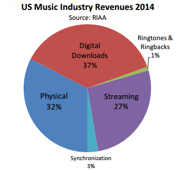 Digital music provided approximately 66% of music industry revenue in 2014 and 98.5% of this revenue came from downloaded and streamed music. Streaming accounted for a bit more than 41% of digital revenue and 27% of overall revenue; downloads accounted for approximately 57% of digital revenue and 37% of overall revenue. Digital music is where it’s at. No surprise there.