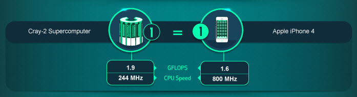The iPhone 4 had roughly the same processing power as the Cray-2. The Cray-2 took up 16 square feet of floor space and weighed 2.75 tons. The iPhone 4 weighed about a quarter of a pound and fit in your pocket. The Sony Ericsson Xperia X10 released in the same year as the iPhone 4 had 25% more processing power. The Samsung Galaxy S6 released in 2015 has the processing power of a bit more than 20 iPhone 4s/Cray-2s.