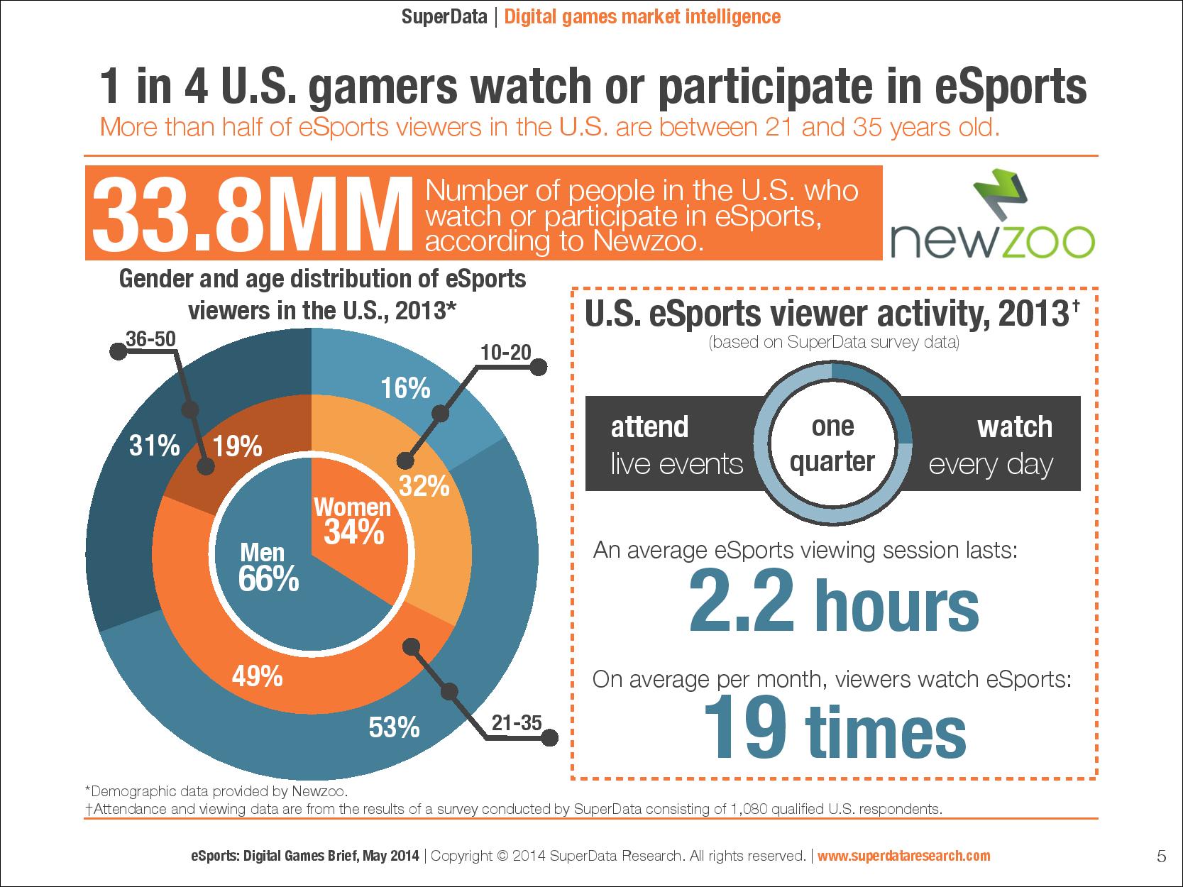 While LoL is a leader in the world of eSports, it is just one game among many. In general, who are the people who watch eSports? Are they in MLB’s target demographic? It is estimated that in 2013 a quarter of all US gamers watched or participated in eSports. The male/female split was 66%/34% which is very similar to MLB’s 70%/30% split. Over half were between 21 and 35 years of age with 84% of the men and 68% of the women aged between 21 and 50. eSports viewers are precisely the demographic that MLB wants.
