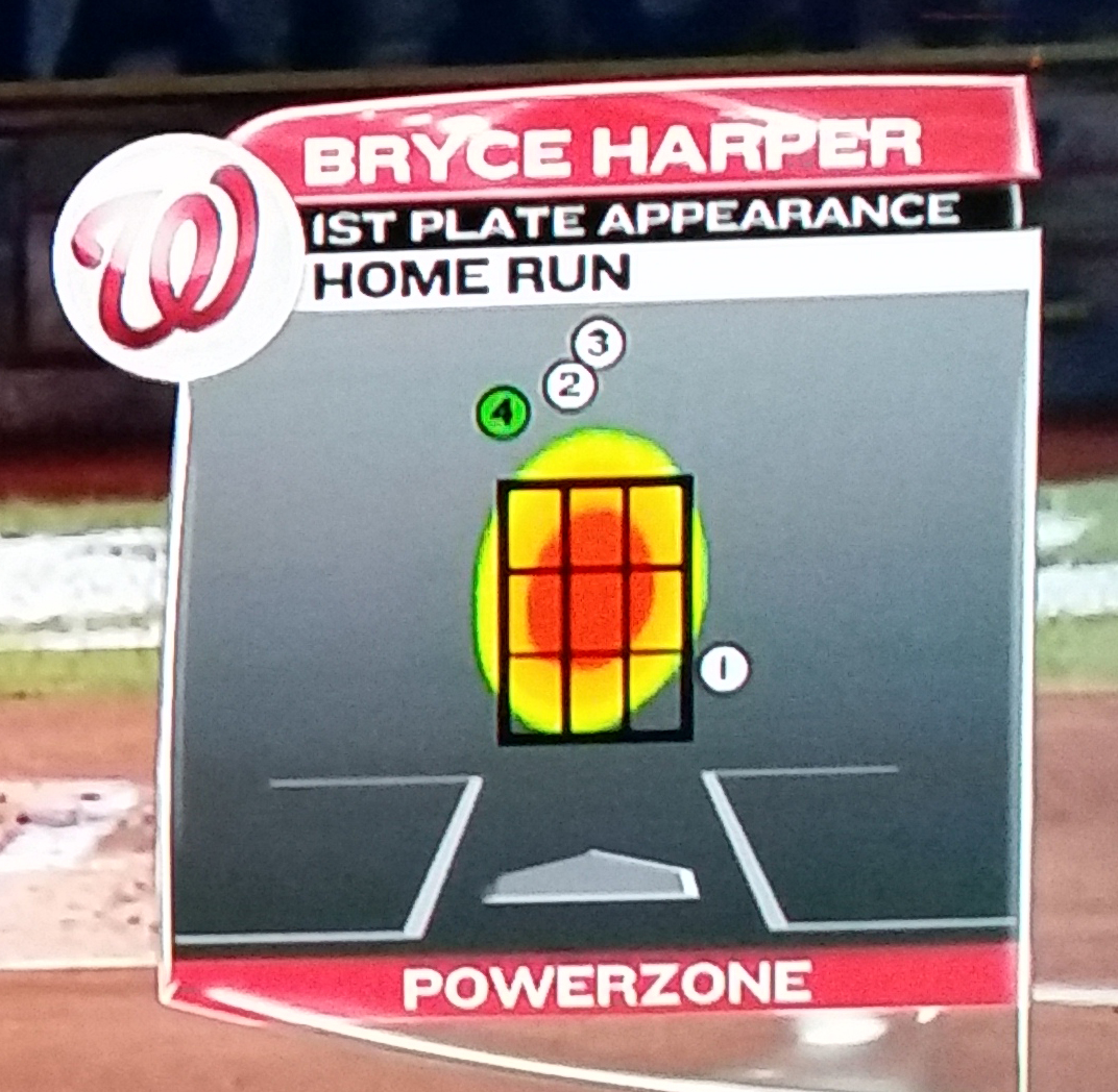 Heat maps. Networks commonly use heat maps to illustrate something about a batter’s performance in different areas in and around the strike zone. Usually these heat maps appear on the screen with little or no commentary about what the map is actually showing. For example, what does the heat map part of the “Powerzone” tell you about Bryce Harper? Does it show the areas of the zone where her puts the ball in play? Where he makes contact that results in a hit? Is slugging percentage somehow factored in or is a single equal to a home run as far as the heat map is concerned?